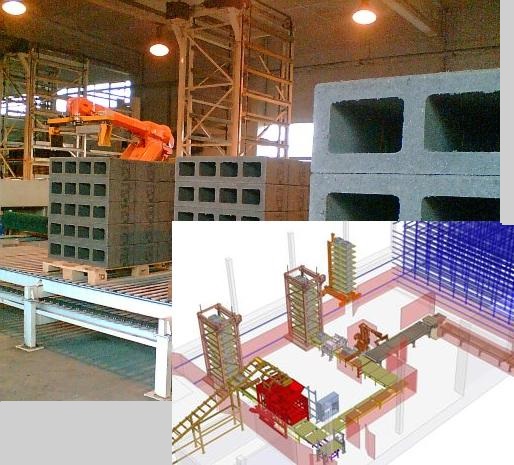 blocchi di cemento che si spostano dal piano di produzione sui pallet di trasporto. Il palettizzatore dispone di un sistema di azionamento e di un sistema di torsione idraulico. Altri movimenti come sollevamento, abbassamento, rotazione